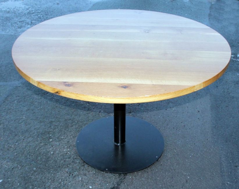 3 x Round Solid Oak Restaurant Dining Tables - Natural Rustic Knotty Oak Tops With Black Cast Iron Bases - Dimensions (approx): ø100 x H75cm - Recently Removed From a Popular Restaurant Environment - Ref: BL/WIQ - CL830 - Location: Altrincham WA14