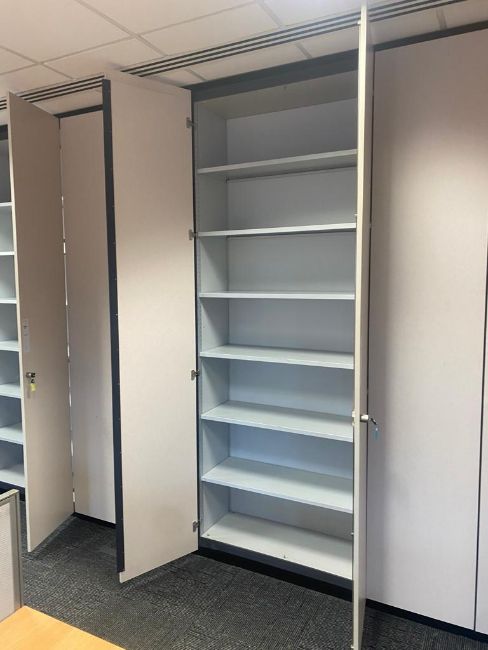 1 x Huge Upright Office Storage Solution Wall Unit With Grey Doors and Internal Shelves - 27 Feet in Length - Includes Some Keys - Size: H272 x L827 cms - Ref: X129 - CL842 - Location: Crawley, RH10