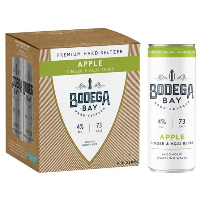 24 x Bodega Bay Hard Seltzer 250ml Alcoholic Sparkling Water Drinks - Apple Ginger & Acai Berry - 4% ABV and Only 73 Calories - Best Before April 2023 - Suitable For Vegans and Vegetarians - Brand New Stock - RRP £53.50 - CL728 - Location: Altrincham WA14