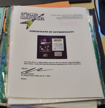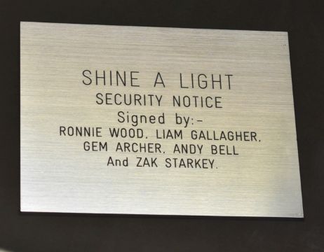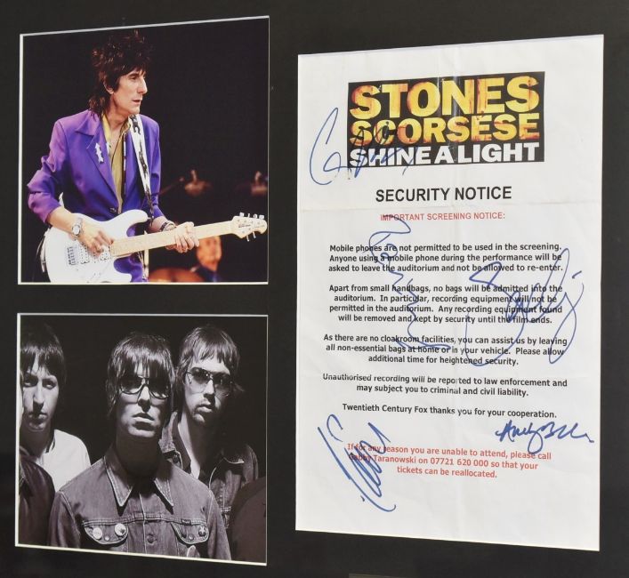 1 x Stones Scorsese 'Shine a Light' A4 Film Security Notice With Authentic BEADY EYE and ROLLING STONES Autographs - Includes COA - Signed by Ronnie Wood, Liam Gallagher, Gem Archer, Andy Bell and Zak Starkey - Professionally Mounted in a Black Frame With Silver Name Plaque - Size: 52 x 55 cms - Ref: RNR3014 - CL720 - Location: Altrincham WA14