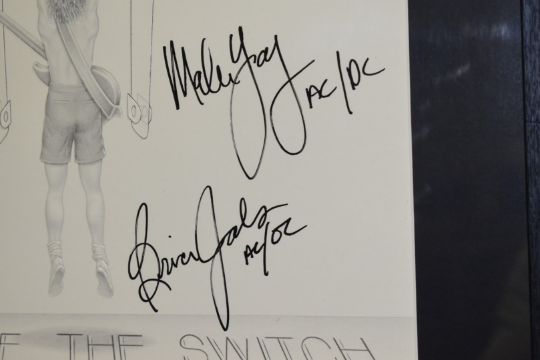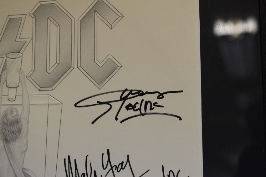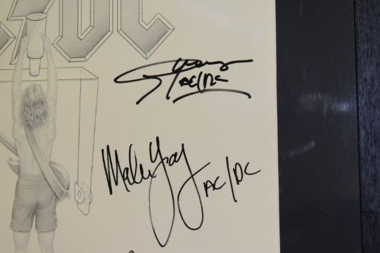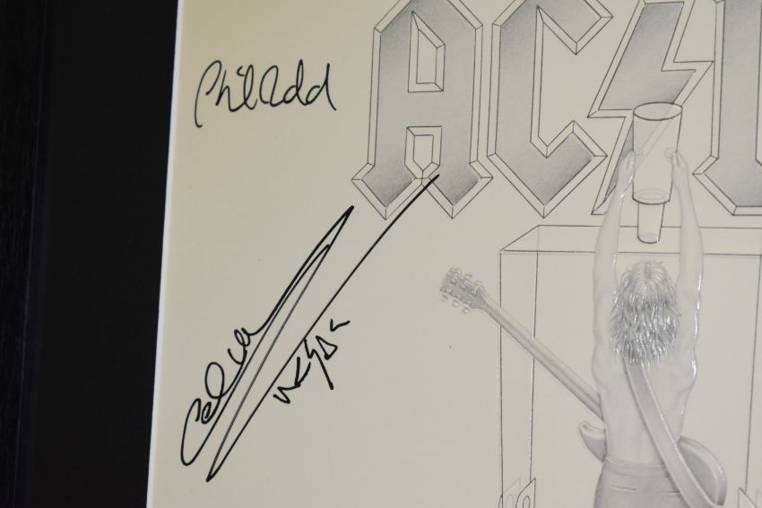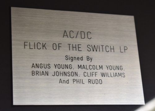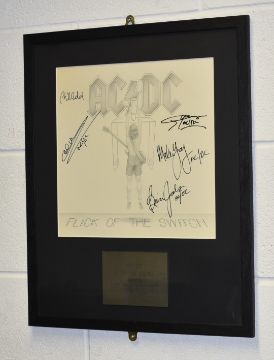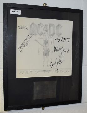 1 x Authentic AC/DC Autographs With COA - New Images Uploaded - Flick of The Switch Album Cover Signed By Dave Evans, Angus Young, Malcolm Young, Larry Van Kriedt and Colin Burgess - Professionally Mounted in a Black Frame With Silver Name Plaque - Size: 53 x 43 cms - Ref: RNR3020 - CL720 - Location: Altrincham WA14