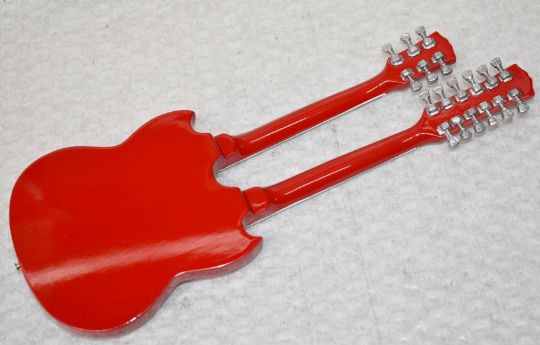1 x Miniature Hand Made Guitar - Led Zeppelin Jimmy Page Twin Neck Gibson SG - New & Unused - RRP £35 - Boxed With Guitar Stand - Approx 11 Inch High - Ref: RR483 CB - CL720 - Location: Altrincham WA14