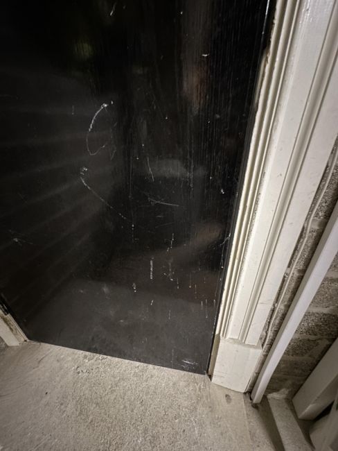 Solid oak wood fire door with Union locks and hardware included. This door is slightly damaged as it opened up to the garage. There are matching items on this sale.