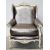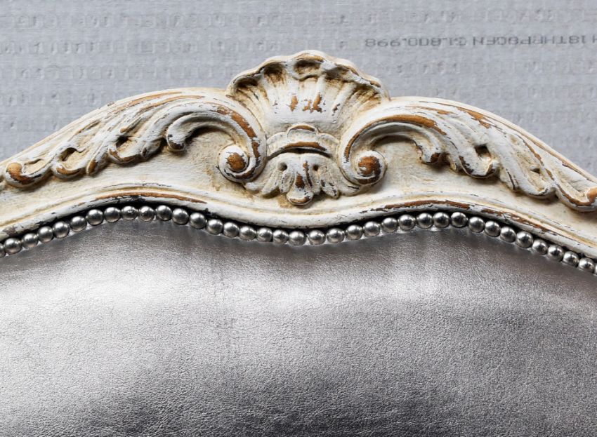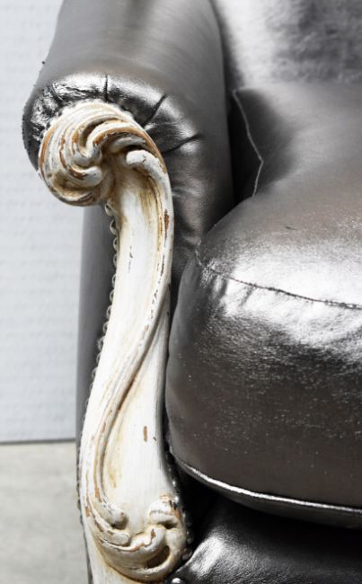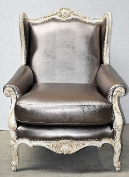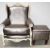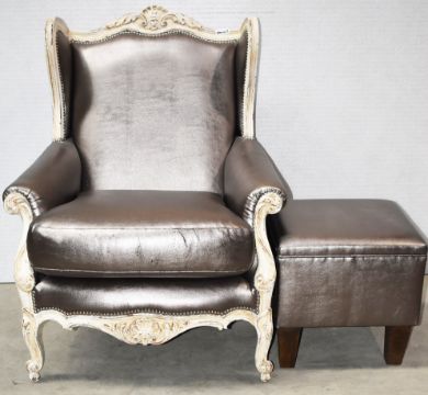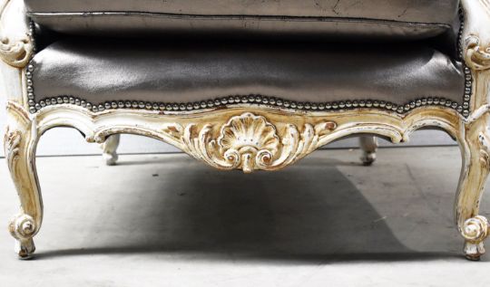 Product Description: Bespoke Baroque armchair is in the French Louis XV inspired High Back Crested Armchair with cabriole legs and very detailed carvings of trailing flowers, scallops and leaves. Matching ottoman in same silver leather.