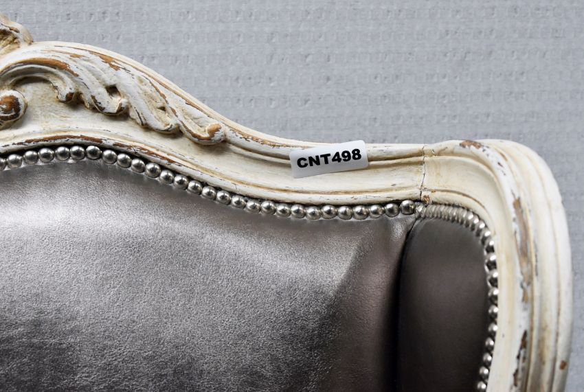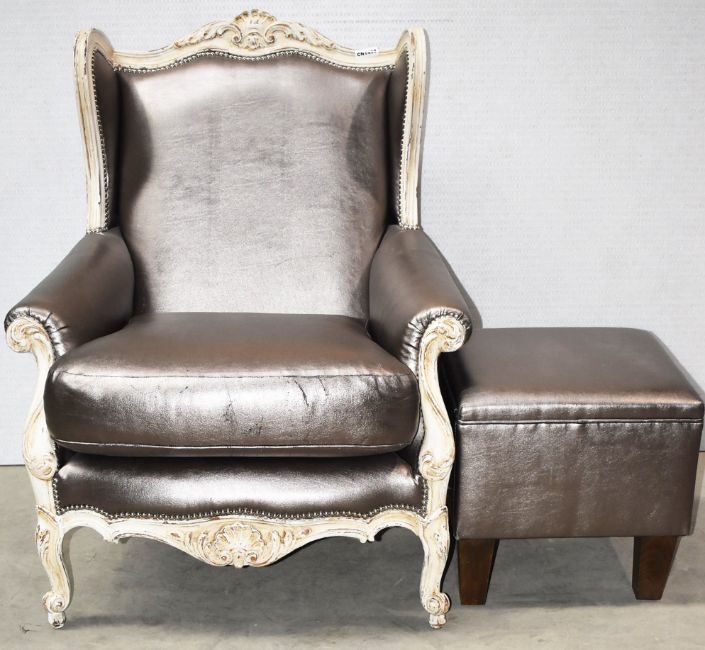1 x Baroque Armchair In Silver Leather High Back Carved Leaf Detailing & Matching Ottoman - Ref: CNT498/CNT499/WH2 - CL845 - NO VAT ON THE HAMMER - Location: Altrincham WA14