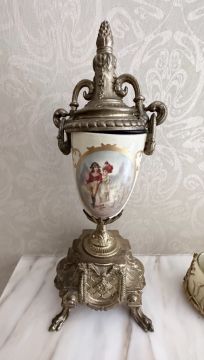 Tis beautiful piece is a French antique with an 'Amorous' scene depicted. Hand painted ceramic and brass base and crown.