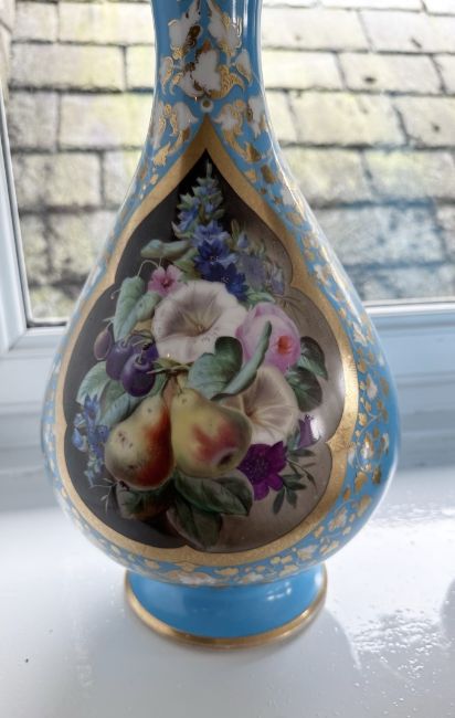 Extremley rare Cloisonne French fine bone china vases that are over 200 years old. Beautiful bright colours and gold leaf design.