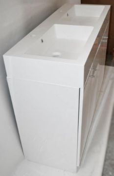 We have here for auction, an ultra-modern 4-door basin unit featuring soft close doors and gloss white finish
