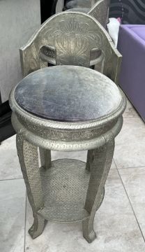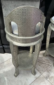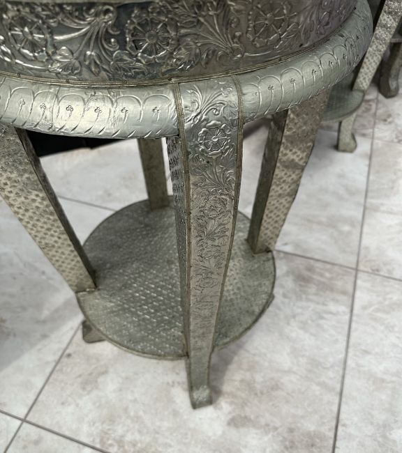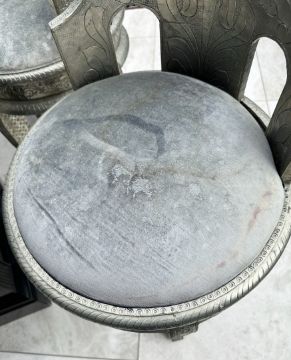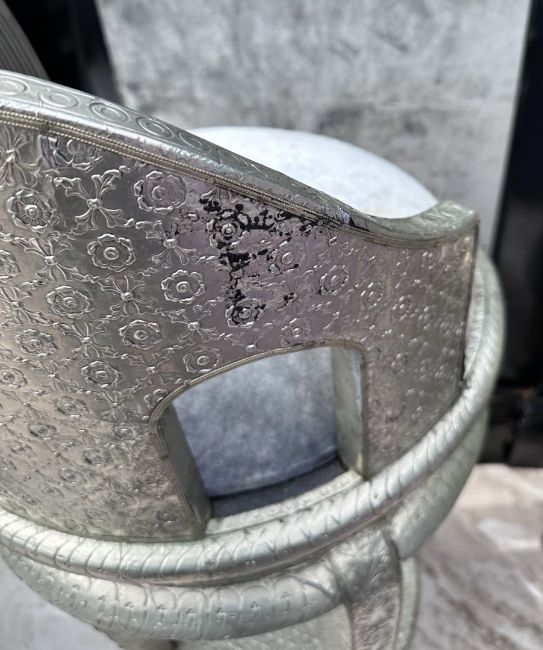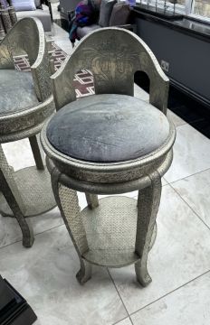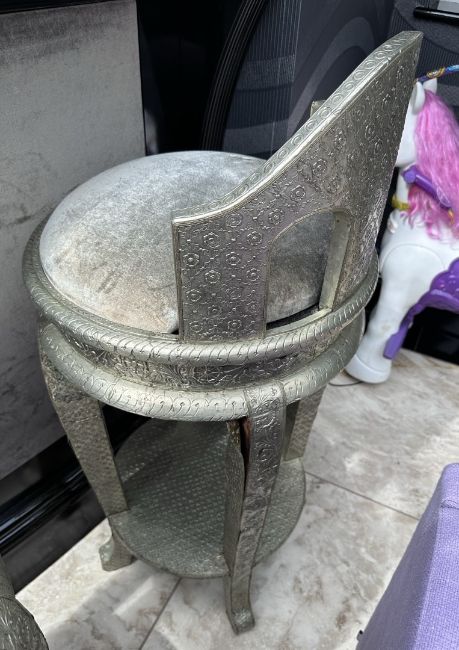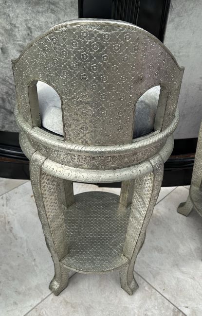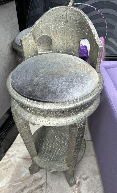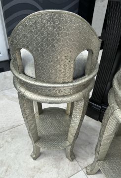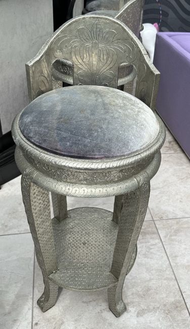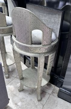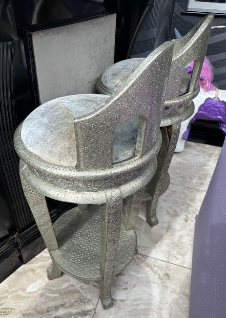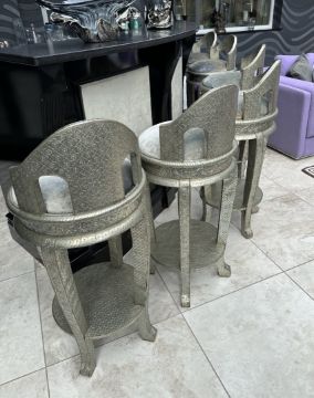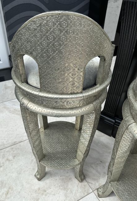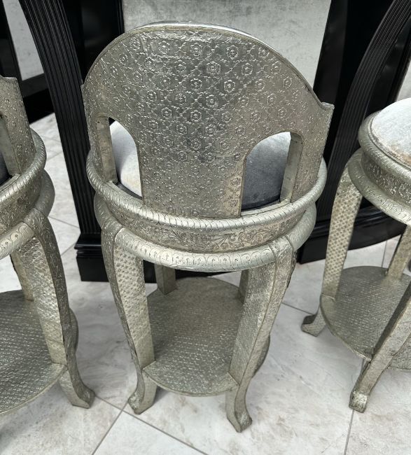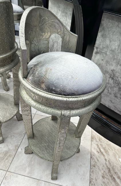 This set of 6 silver decorative metal bar stools were handcrafted in India and match other items available in this auction. The seat pads are slightly stained but could be easily recovered.