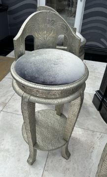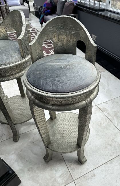 6 x Ornate Silver Bar Stools With Grey Velvet Seat Pads - Ref: SKBR009 - CL853 - NO VAT ON THE HAMMER - Location: Barrowford BB9