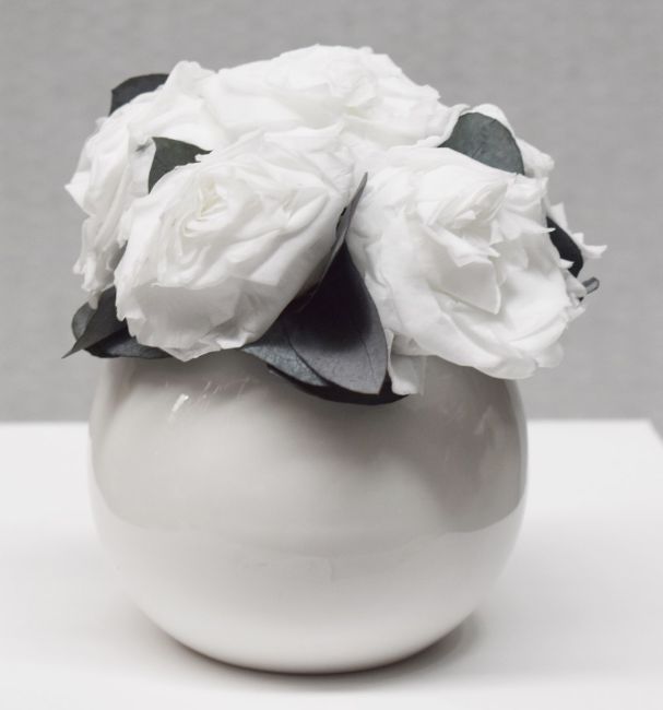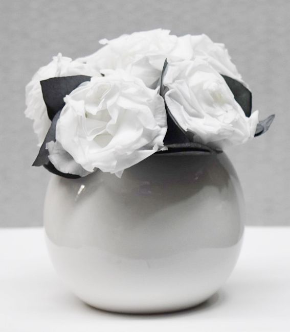 Item description: This Ethereal Blooms Maya vase and preserved white roses set allows you to have perfect, fresh-looking blooms in the house all the time. Using the latest bio-technology, six real white roses have been expertly treated to remain fresh for up to a year – and this vase makes an elegant home for them.