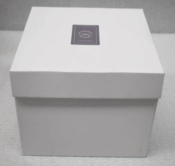Presented in an Ethereal Blooms gift box. Includes a vase, six treated white roses and foliage.