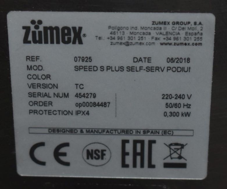 1 x Zumex Speed S +Plus Self-Service Podium Commercial Citrus Juicer - Manufactured in 2018 - Ideal For Hotels, Restaurants, Bistros or Health Food Environments - Recently Removed From Major Super Market Store - CL232 - Ref: LF282 - Location: Altrincham WA14