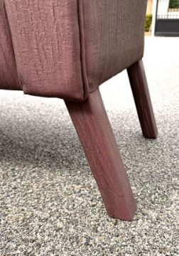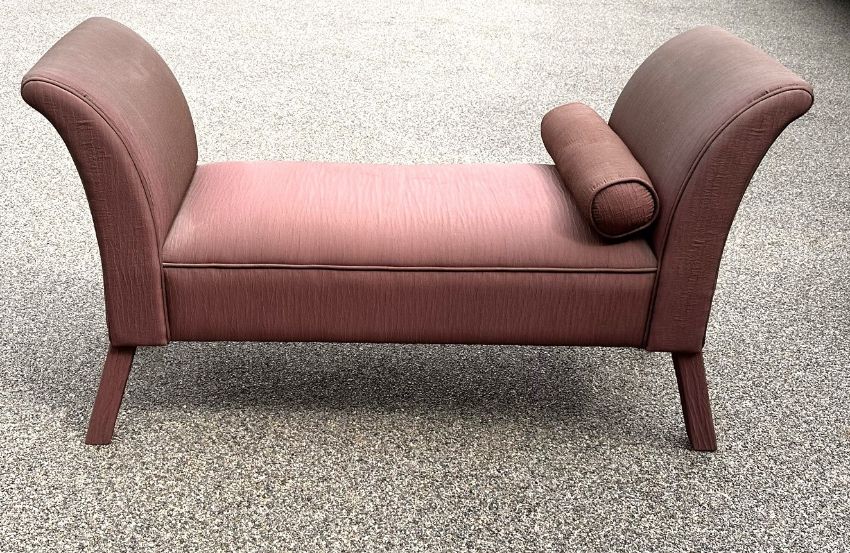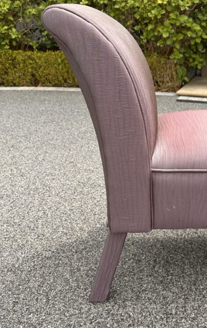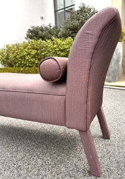 This elegant Chaise Longue was bespoke made in purple slub satin, has a matching bolster cushion and stands on dark wooden legs .