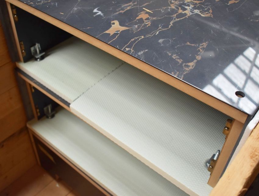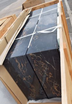 The units architecture is pure, clean and timeless, featuring sleek metal frames with a brushed brass finish, sitting atop polished black marble-effect platforms.