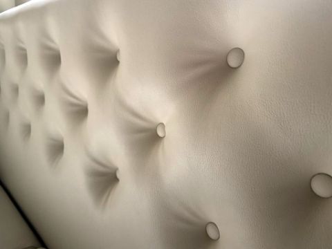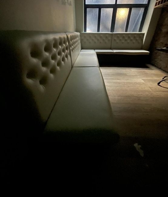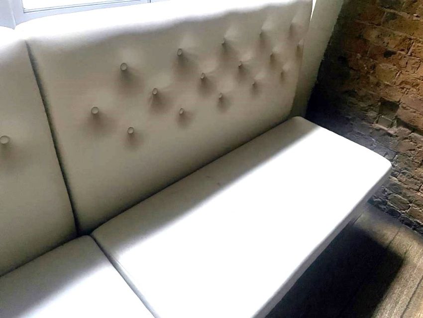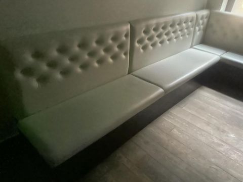 1 x Corner Seating Bench Upholstered in Beige Studded Back Leather Upholstery - Dimensions: 290 x 230 cms - Situated in a Contemporary Mayfair Restaurant - CL879 - Location: Mayfair, London, W1S