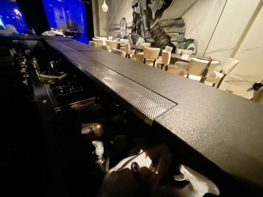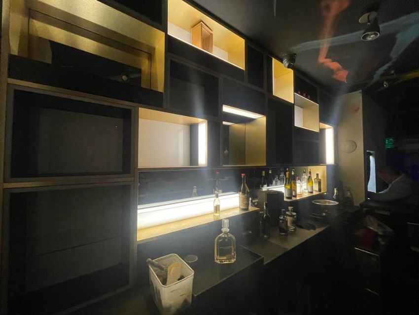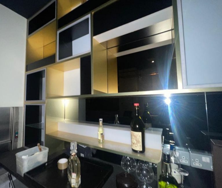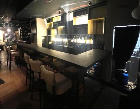 1 x Bespoke Mirrored Drinks Bar Featuring a Stone Countertop and Illuminated Backbar With Wine Bottle Shelves - Includes Stainless Steel Prep Units, Ice Wells, Bottle Speed Rails, Wash Basins, Hobart Glasswasher and Bottle Cooler - Situated in a Contemporary Mayfair Restaurant - CL879 - Location: Mayfair, London, W1S