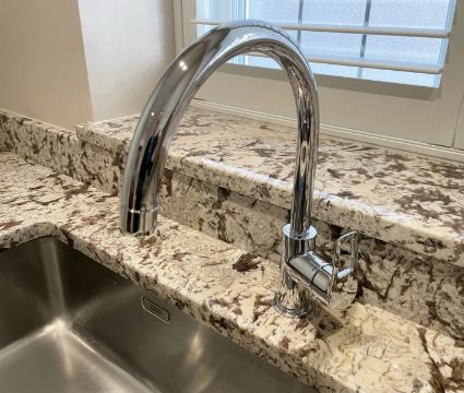 A nicely appointed kitchen in good order, that offers a plethora of storage and a FRANKE stainless steel sink.
