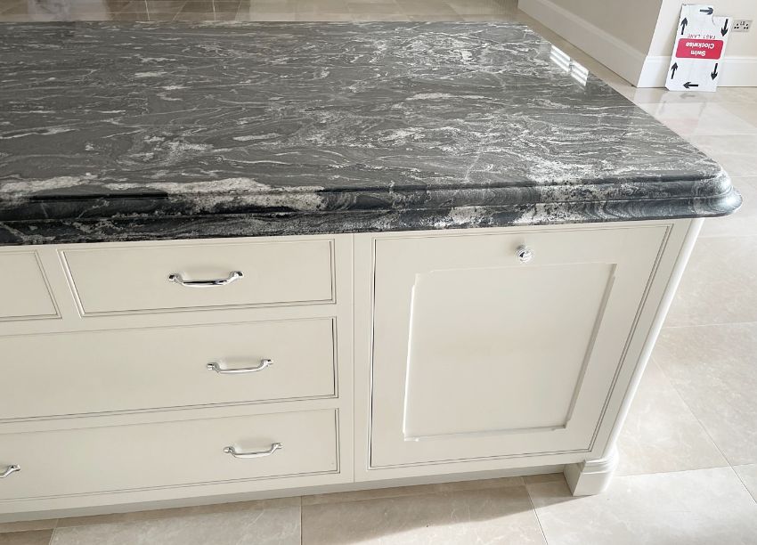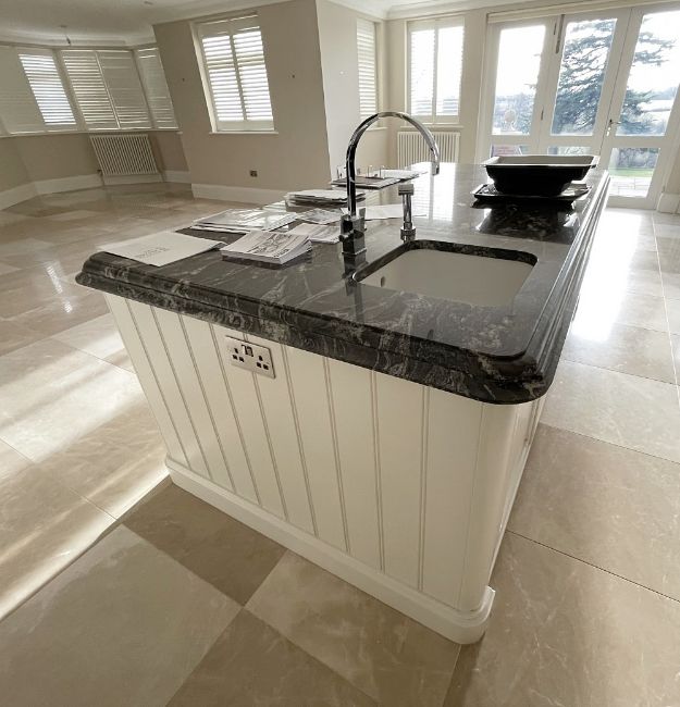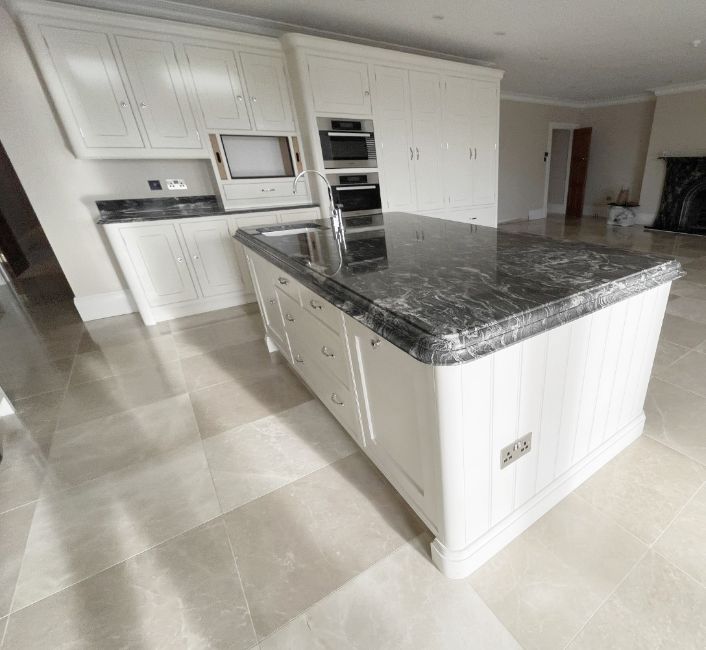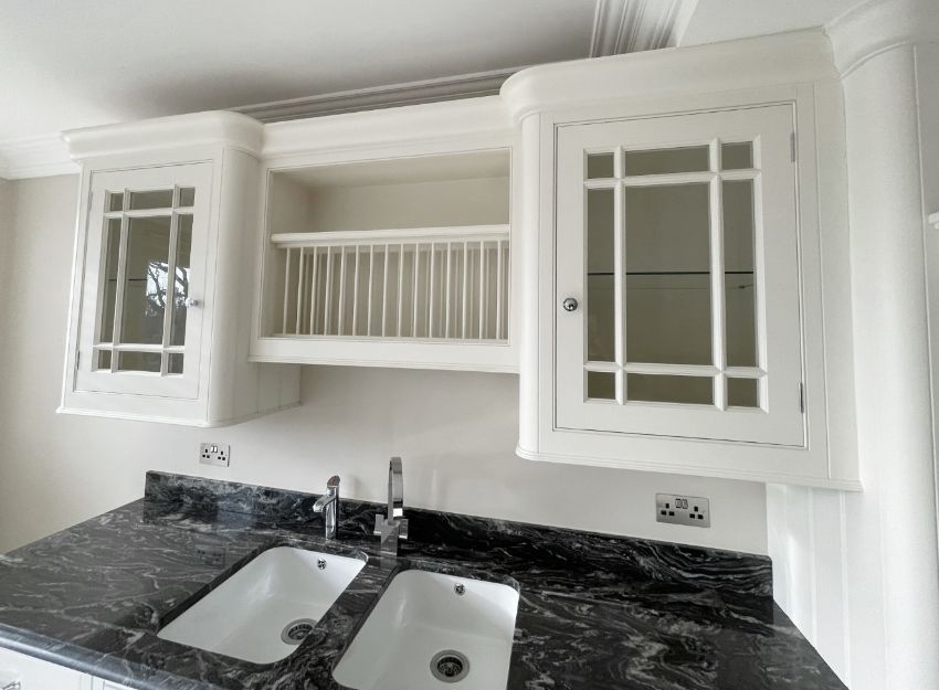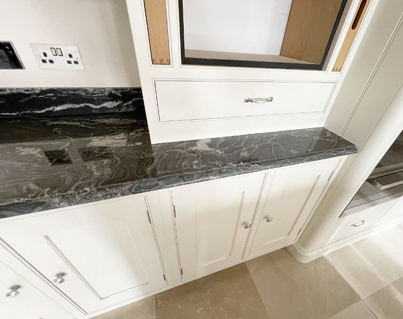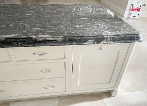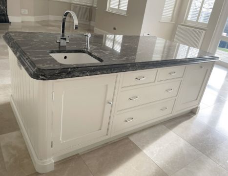 The centrepiece of an impessive 38ft dining area, This striking installation was a bespoke project by JD Fletcher & Son of Wilmslow, and features an impressive selection of made-to-measure storage units, all handpainted and craftmen-built to the highest standards and topped in exquisitely cut and bevelled marble surfaces.