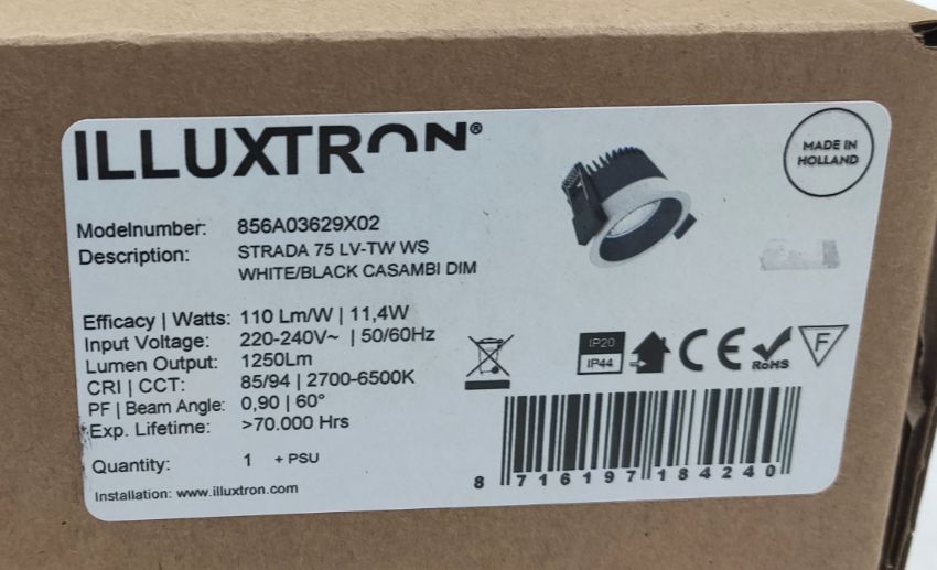 1 x ILLUXTRON Strada 75 Downlight In White - Lv-Tw Ws White/Black Casambi Dim 1250Lm 2700-6500K 60Deg - 856A03629X02 - Ref: ATR192/ATRPE - CL891 - Location: Altrincham WA14