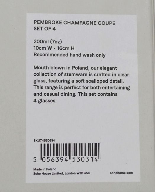 Item Description: You don’t have to be a member to indulge in the Soho Home Pembroke collection – these elegant Champagne coupes offer the exclusivity and luxury of the global clubs within your personal interior. Notable for its softly scalloped structure, the mouth-blown shape is inspired by the glassware of the first House at 40 Greek Street, London, where Soho House's story began in 1995.