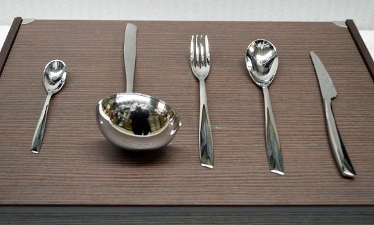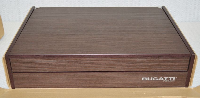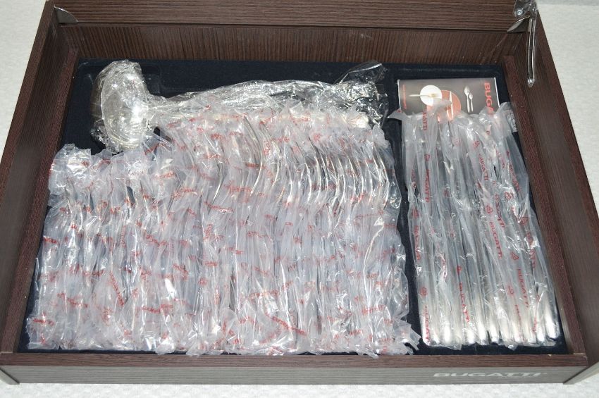 Includes 12 table knives, 12 table forks, 12 table spoons, 12 coffee spoons and 1 ladle Presented in a wooden Bugatti box.