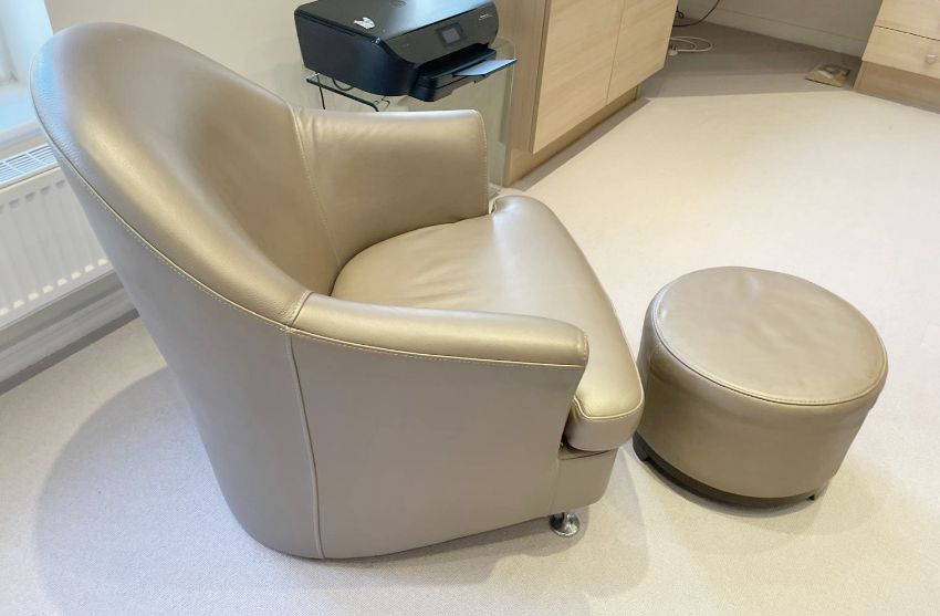 Condition Report: Purchased from New, both Armchair and Footstool have since remained in situ and are presented in very good condition with onlly mild signs of use, including a faint scratch on one arm as highlighted in our on-site photography provided.