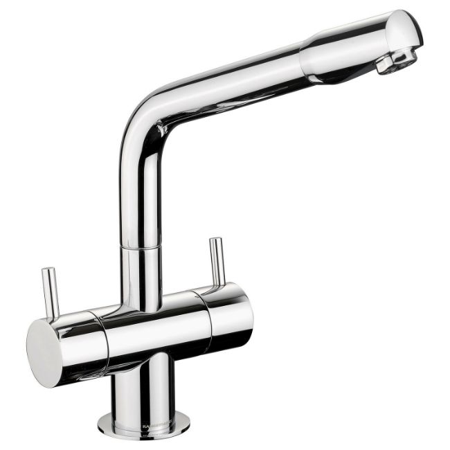 The Rangemaster Aspire Dual Lever Monobloc Kitchen Tap features a minimalist flat spout design with complementary handles, with a dual lever control that adds a high-end design finish to any contemporary kitchen scheme.
