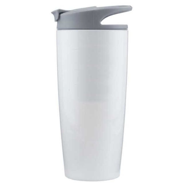 A white 700ml (25oz) tumbler made from PP with screw top, sip through lid in grey. Mixer can be easily added/removed.